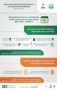 وأكدت المديرية العامة للجوازات أنه بعد انتهاء المهلة المحددة (90 ) يوماً سيتم إيـقاف جميـع سجلات المخالفين الذين استفادوا من الإعفاءات خلال المهلة ولم يلتزموا بالمغادرة خلالها وستطبق بحقهم جميع العقوبات المقررة نظاماً ، ولمراجعة إدارات الجوازات وإدارات وشعب متابعة الوافدين في المناطق والمحافظات يجب أخذ موعد عن طريق خدمة المواعيد من خلال بوابة وزارة الداخلية للخدمات الإلكترونية .