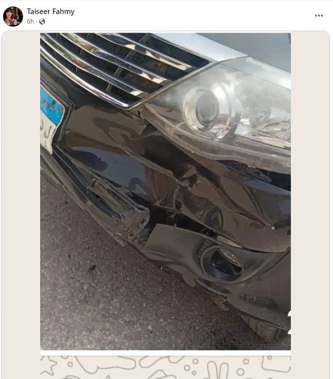ونشرت تيسير فهمي صورة للأضرار التي لحقت بسيارتها، وكتبت: " قدر الله وما شاء فعل"، وحرص متابهوها على تمنى السلامة لها.