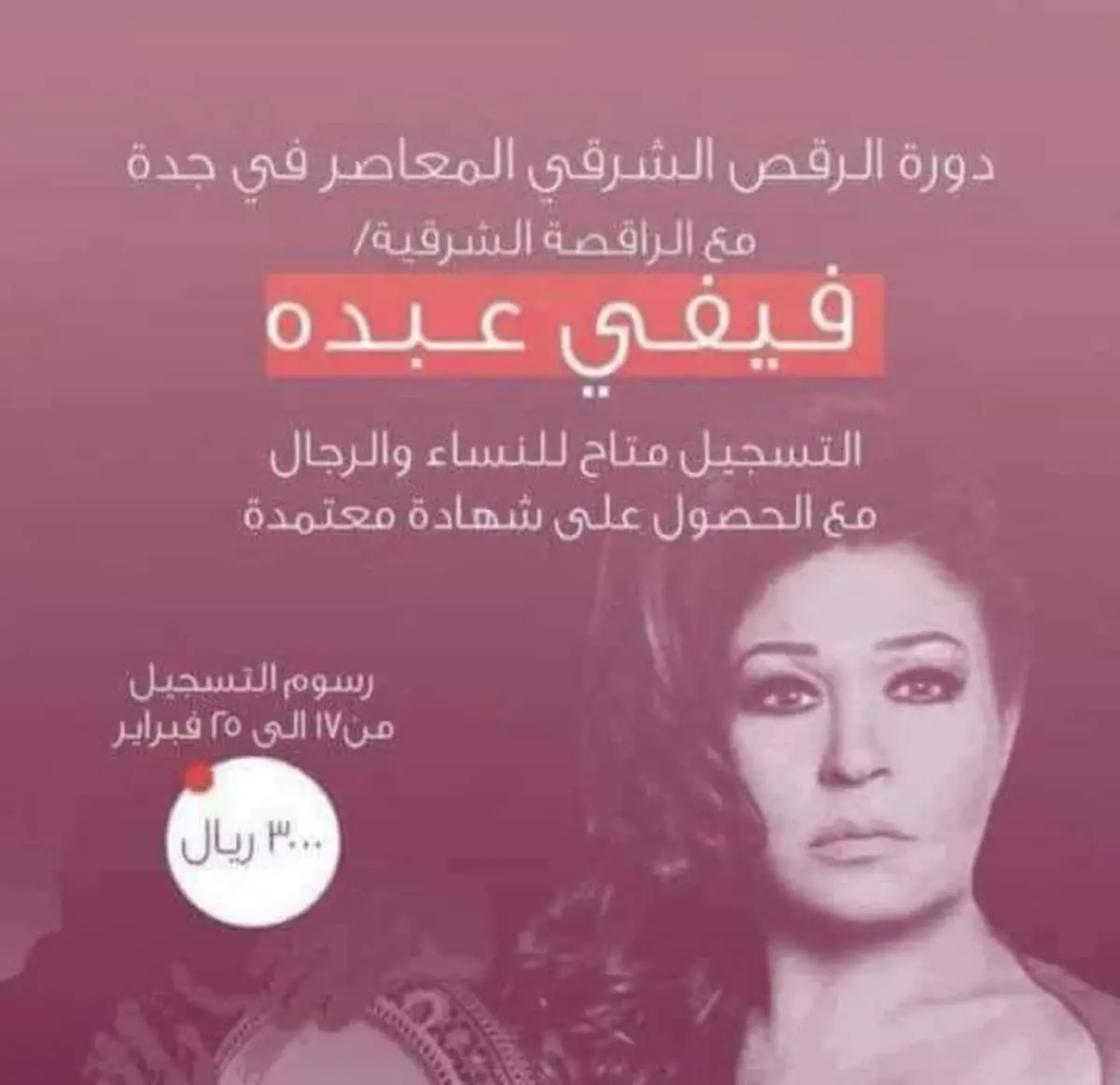 وتداولت صفحات مواقع التواصل الاجتماعي، صورة لإعلان عن دورات رقص للرجال والسيدات بالسعودية، تتم تحت إشراف فيفي عبده من 17 إلى 25 من شهر شباط/فبراير الجاري.