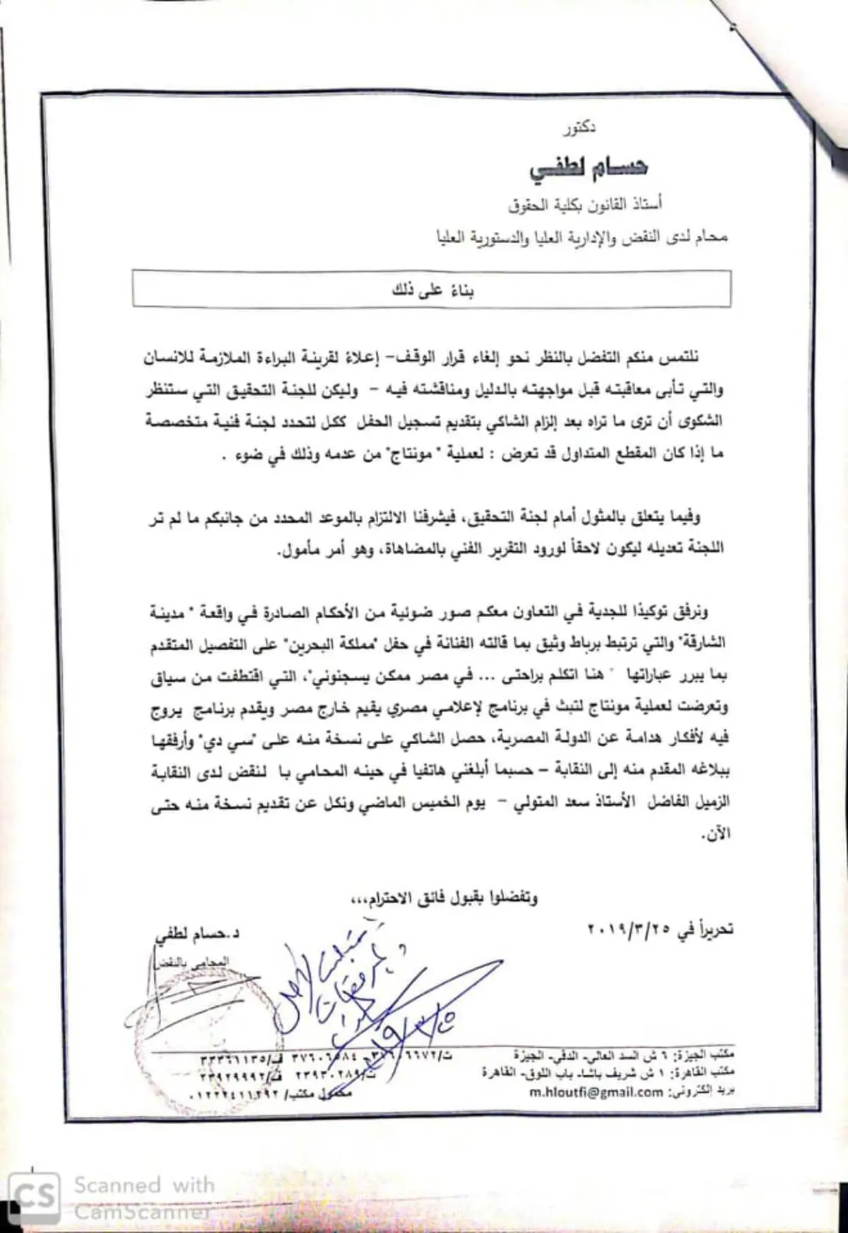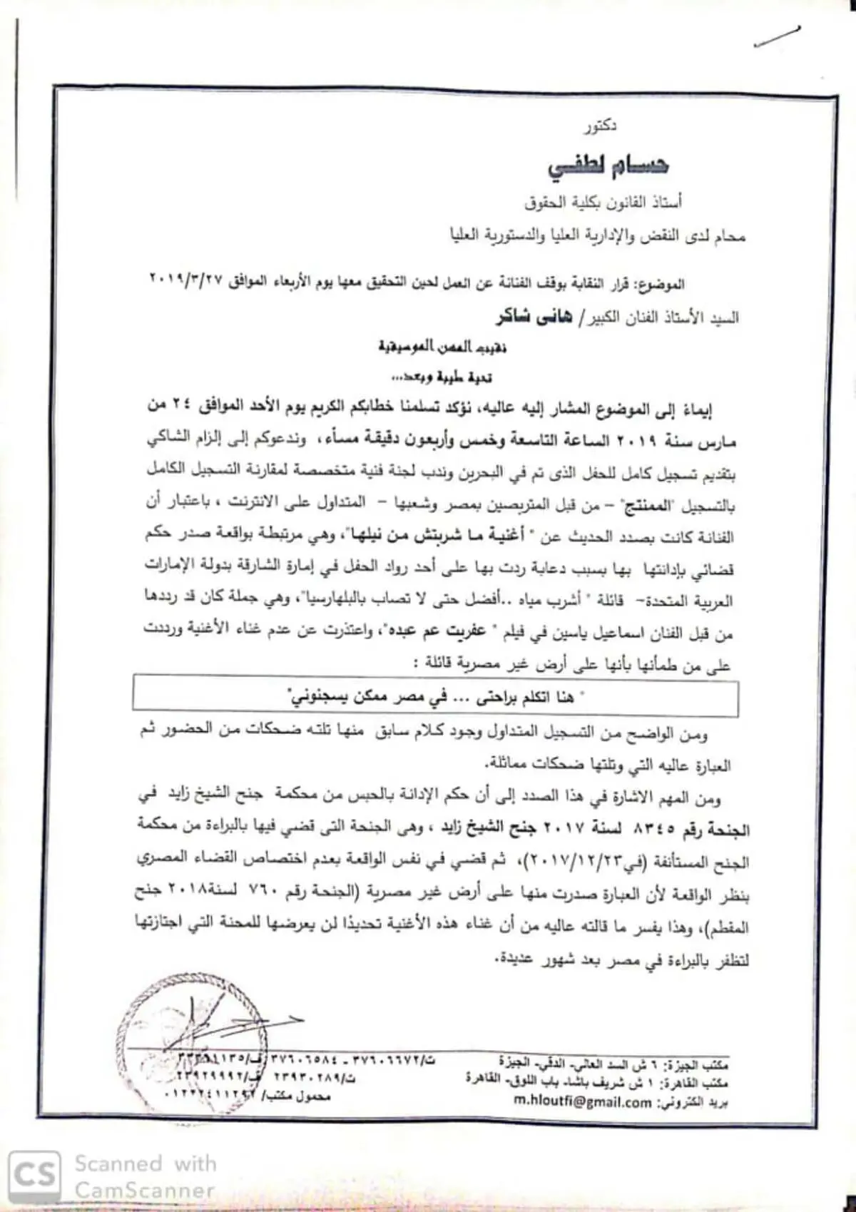 طالب حسام لطفي، محامي الفنانة المصرية شيرين عبدالوهاب، في خطاب رسمي وجهه للفنان المصري هاني شاكر، بصفته رئيسًا لنقابة المهن الموسيقية المصرية، بـ"إلغاء قرار توقيف شيرين عن الغناء"، على خلفية اتهامها بالإساءة لمصر في حفلها الغنائي الأخير بمملكة البحرين.