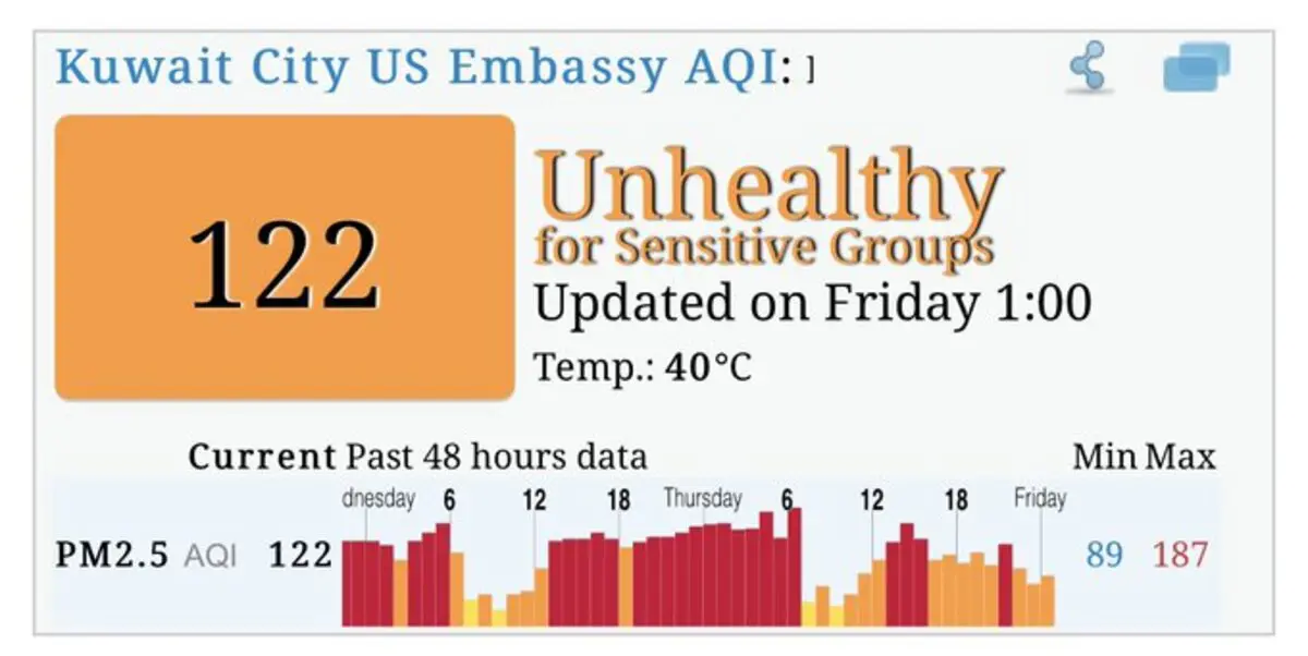 أعلنت جماعة الخط الأخضر البيئية في دولة الكويت عبر حسابها في موقع التواصل "تويتر"، عن تلوث أجواء الكويت بشكل ضار، مسببًا للأمرض.