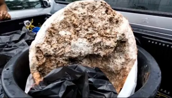 اتصل الصياد بابن عمه؛ لمساعدته على أخذ الكتل الغامضة إلى المنزل، وبدآ في فحصها، وبدت الكتل الصخرية الكبيرة تشبه مادة العنبر الثمينة للغاية، التي تفرزها الحيتان وتحتوي على مادة كحولية قيمة للغاية تُستخدم في العطور مثل شانيل No5.