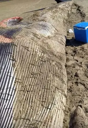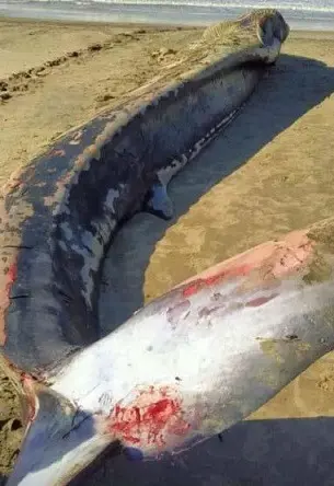 وكانت أنثى الحوت نافقة وقذفتها الأمواج نحو ساحل منطقة بركة غليون التابعة لمركز بلطيم على ساحل البحر المتوسط.