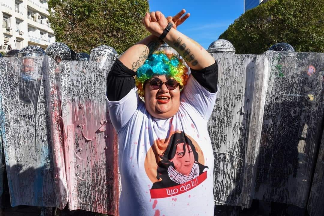 وشاركت العمدوني في المسيرة الاحتجاجية التي انتظمت مطلع شهر شباط فبراير الماضي في شارع الحبيب بورقيبة بالعاصمة، والتي تم خلالها رشق أعوان الأمن بالطلاء.