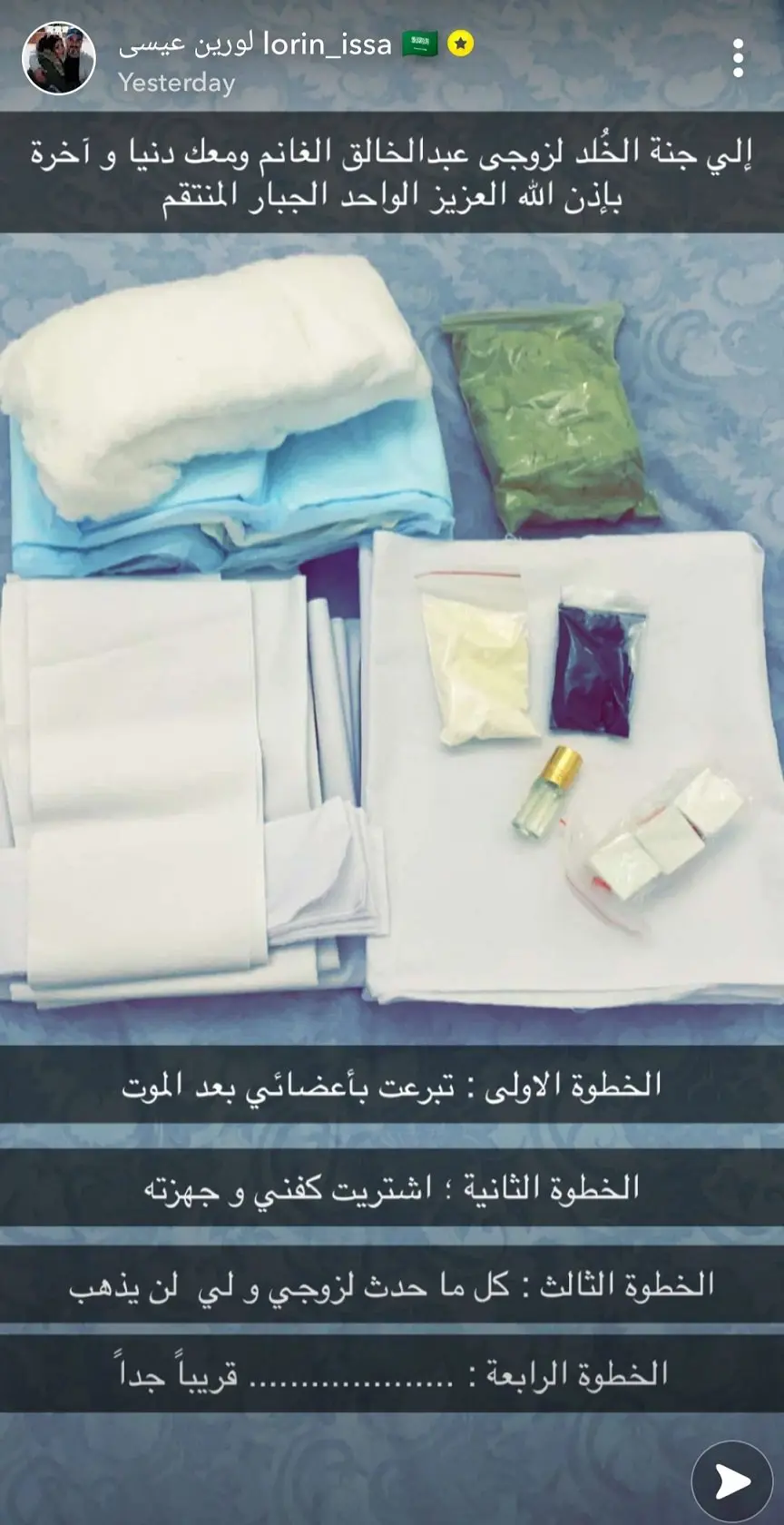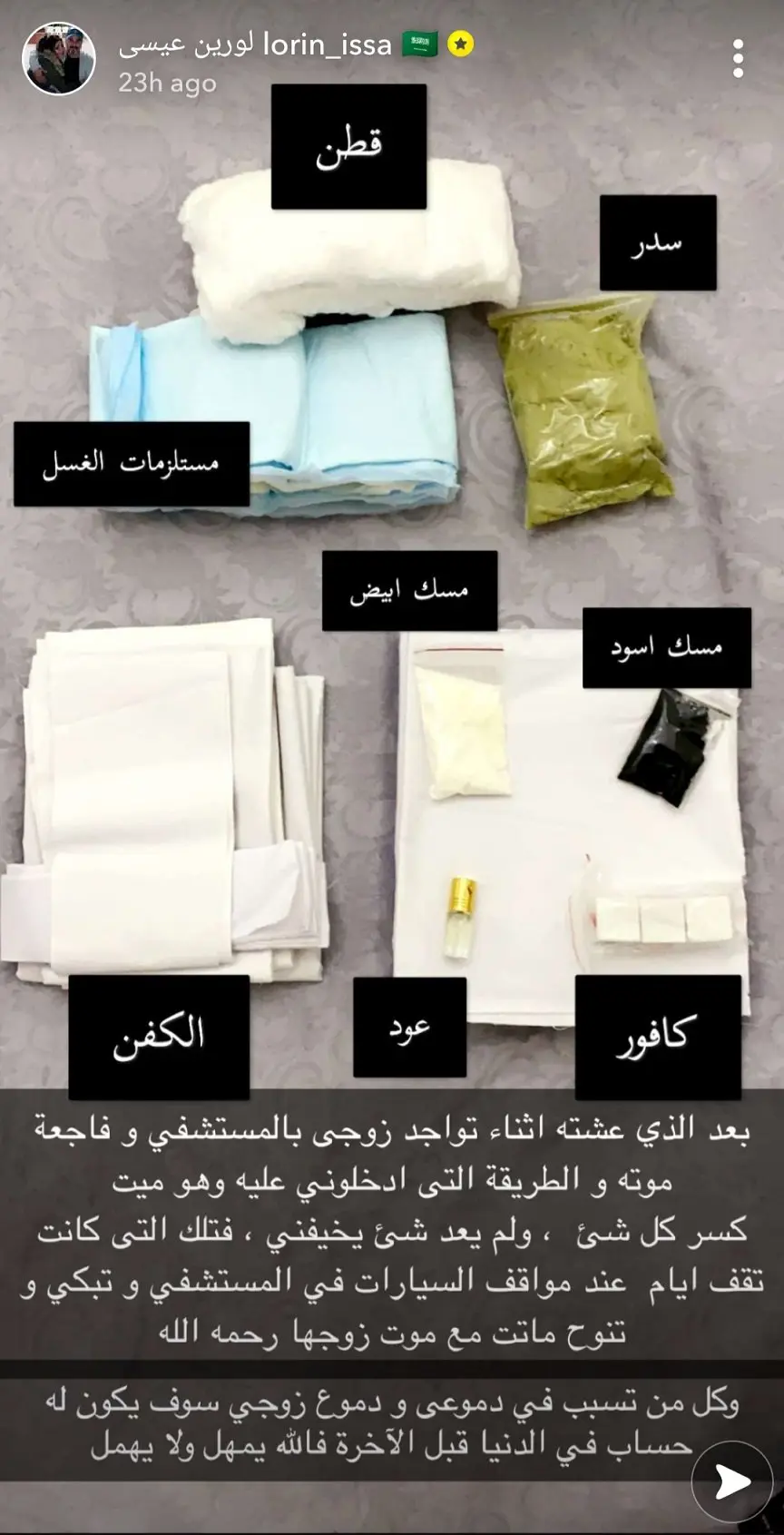 ونشرت لورين عيسى تلك التصريحات عبر حسابها في تطبيق "سناب شات"، مؤكدة أنها اشترت "كفنها"، وجهزته استعدادا للرحيل، متمنية أن يكون زوجها في جنة الخلد، وأن تكون معه كما كانت في الدنيا.