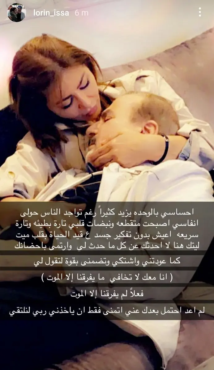 وكانت لورين عيسى، شاركت متابعيها عبر حسابها في موقع ”إنستغرام“ صورة جمعتها بزوجها عبد الخالق الغانم، في خاصية الـ ”ستوري“، قالت فيها إنها تعاني الوحدة دونه، ولا تجد من يطمئنها كما كان يفعل معها في كل موقف تمر به.