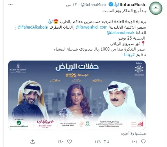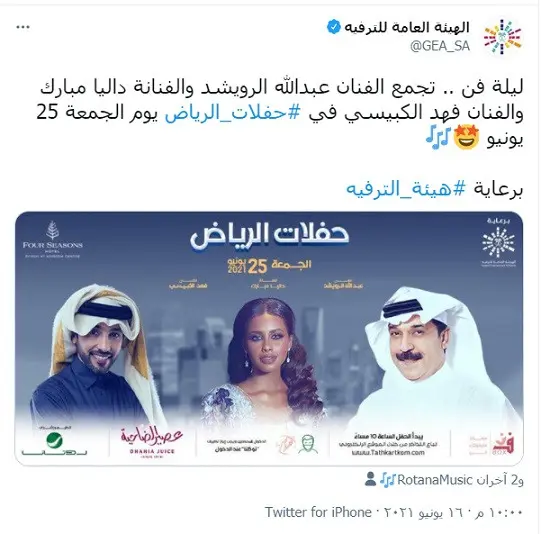 وقالت الهيئة عبر حسابها في تويتر: "ليلة فن.. تجمع الفنان عبدالله الرويشد والفنانة داليا مبارك والفنان فهد الكبيسي في حفلات الرياض يوم الجمعة الـ25 من يونيو".