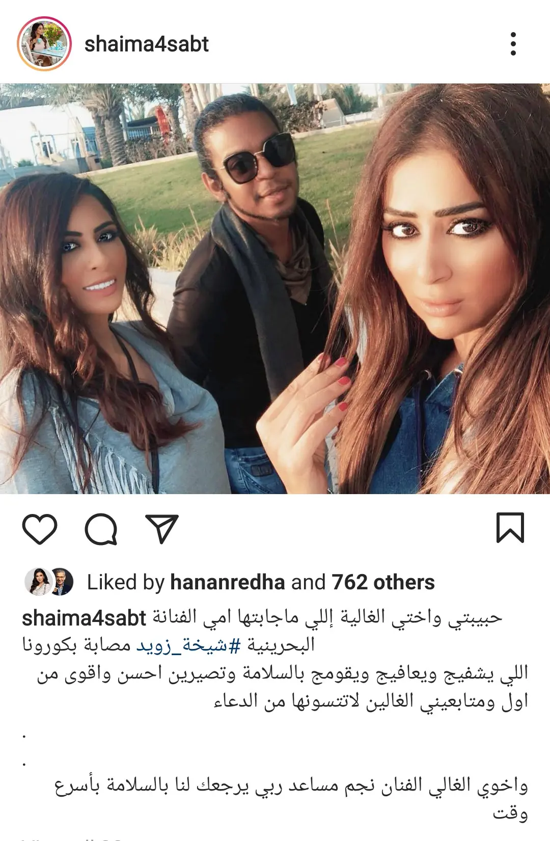 وكتبت سبت: "حبيبتي وأختي الغالية اللي ما جابتها أمي، الفنانة البحرينية شيخة زويد مصابة بكورونا".