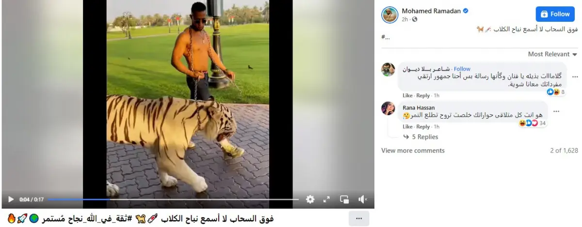 وظهر "رمضان" في الفيديو وهو يسير بالنمر الذي قيده بسلسلة طويلة، وعلق قائلًا: "فوق السحاب لا أسمع نباح الكلاب.. ثقة في الله نجاح مُستمر".