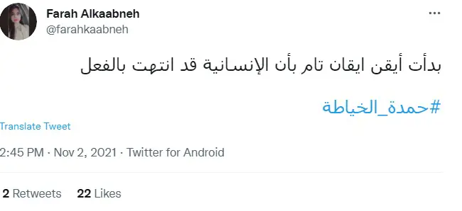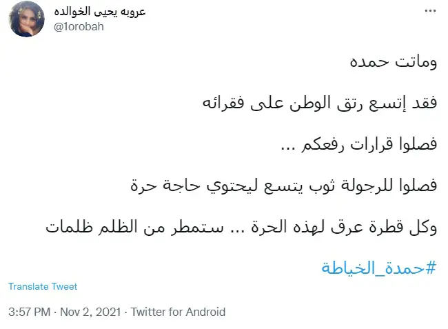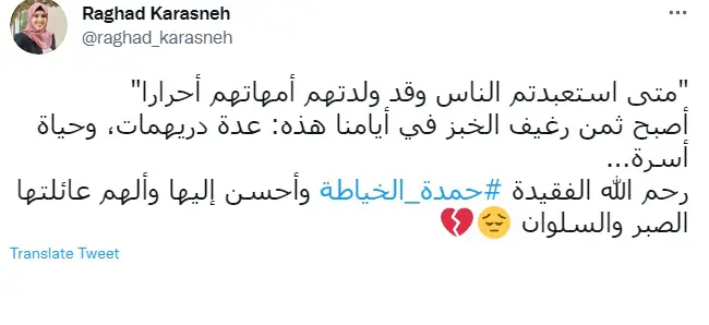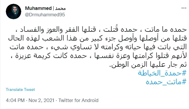 وقال الصحفي أحمد حسن الزعبي: "نحن الشعب أبناء #حمدة_الخياطة تنتابنا نوبة حزن وعجز وظلم جراء الإهانة والتسلط لنموت كل يوم..".