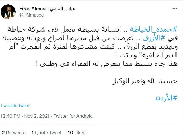 أثار تسبب مدير مصنع في الأردن بوفاة سيدة تعمل خياطة، واسمها حمدة، حالة من الغضب والجدل في البلاد، بعدما انتشرت أنباء عن وفاتها نتيجة إهانتها من رئيسها في العمل.