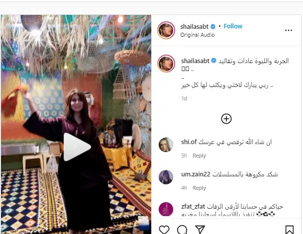 وكانت الفنانة شيلاء سبت الشقيقة الكبرى للعروس قد نشرت، الأربعاء، مقطع فيديو لها أثناء أدائها رقصة على أنغام أغنية تراثية من ضمن أجواء الاحتفال بقرب موعد زفاف شقيقتها الصغرى.