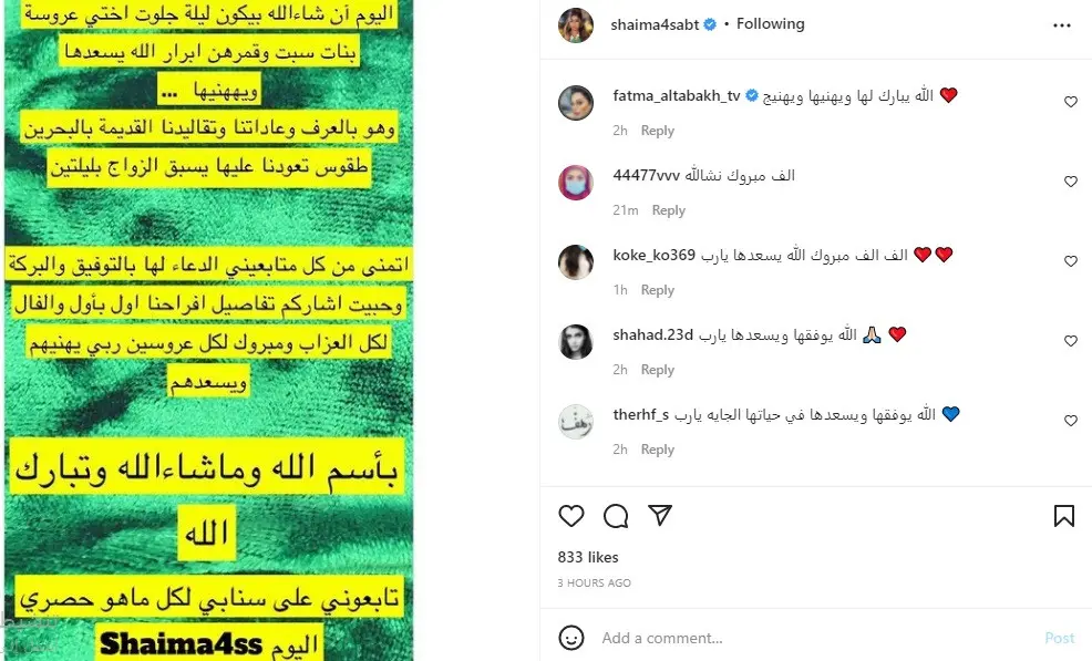 وقالت شيماء سبت في منشور عبر حساباتها في مواقع التواصل الاجتماعي: "اليوم إن شاء الله بيكون ليلة جلوة أختي عروسة بنات سبت وقمرهن أبرار الله يسعدها ويهنيها".