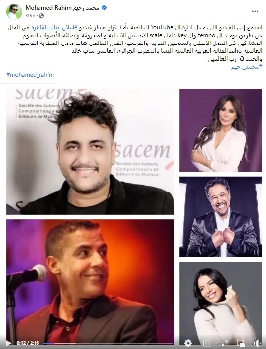 وكتب محمد رحيم منشورا على حسابه على فيسبوك في ساعة متأخرة من مساء السبت أعلن خلاله عن حظر إدارة يوتيوب للإعلان محل النزاع.