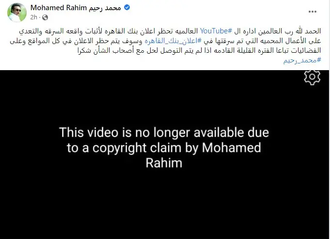 وأوضح رحيم في منشوره: "الحمد لله رب العالمين، إدارة موقع يوتيوب تحظر إعلان بنك القاهرة لإثبات واقعة السرقة والتعدي على الأعمال المحمية التي تمت سرقتها في إعلان بنك القاهرة، وسوف يتم حظر الإعلان في كل المواقع والفضائيات تباعًا الفترة المقبلة، إذا لم يتم التوصل لحل مع أصحاب الشأن".