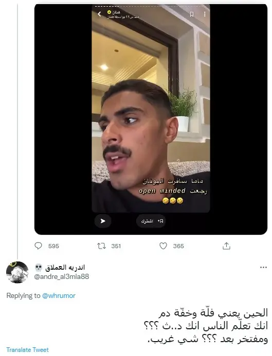 وفوجئ متابعون بتفاعل "أندريه العملاق" مع الفيديو المعني لـ"هتان"، حيث هاجمه بوصفه أنه "ديوث"، إذ انتقده في تغريدة بالقول: "الحين يعني فلّة وخفّة دم انك تعلّم الناس انك د..ث ؟؟؟ ومفتخر بعد ؟؟؟ شي غريب".