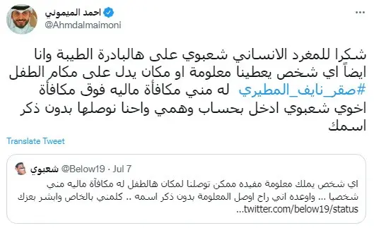 وكتب الميموني في تغريدته عبر حسابه في موقع "تويتر": "شكرا للمغرد الإنساني شعبوي على هالبادرة الطيبة وأنا أيضا أي شخص يعطينا معلومة أو مكان يدل على مكام الطفل. #صقر_نايف_المطيري له مني مكافأة ماليه فوق مكافأة أخوي شعبوي ادخل بحساب وهمي واحنا نوصلها دون ذكر اسمك".