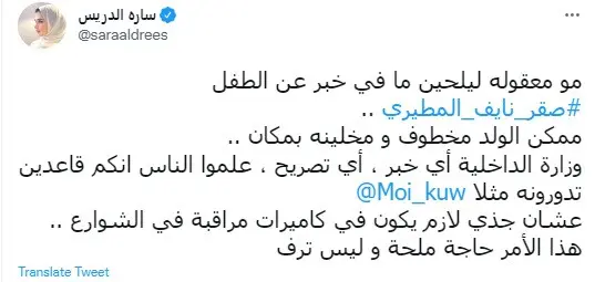 وقال في تغريدة له: "أي شخص يملك معلومة مفيده ممكن توصلنا لمكان هالطفل له مكافآة ماليه مني شخصيا… وأعِده أني راح أوصل المعلومة دون ذكر اسمه.. كلمني بالخاص وابشر بعزك".