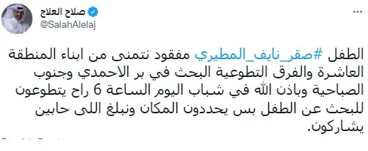 وكتب المحامي "صلاح العلاح" عبر حسابه: "الطفل #صقر_نايف_المطيري مفقود نتمنى من أبناء المنطقة العاشرة والفرق التطوعية البحث في بر الأحمدي وجنوب الصباحية وبإذن الله في شباب اليوم الساعة 6 راح يتطوعون للبحث عن الطفل بس يحددون المكان ونبلغ اللى حابين يشاركون".