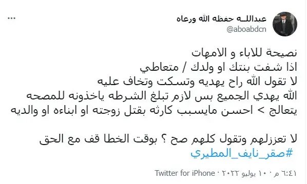 ووجه عبدالله نصيحة للآباء والأمهات، قائلا: "نصيحة للآباء و الأمهات.. إذا (شفت) بنتك أو ولدك، متعاطيا