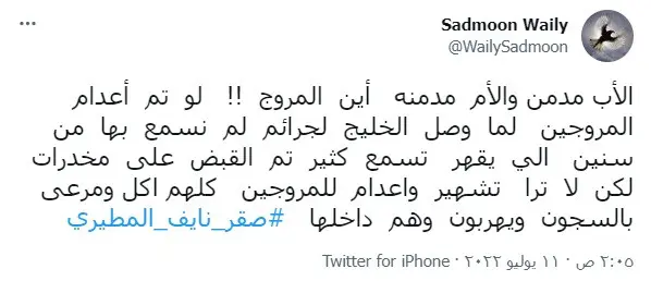 ولم يكتف الناشطون بهذه المطالب، للحد من تعاطي المخدرات الذي يتسبب بوقوع جرائم بشعة كثير منها يتحول لقضية رأي عام، حيث دعا ناشط إلى ضرورة إعدام والتشهير بمروجي المخدرات.