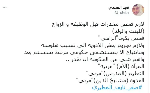 وذهب بعض الناشطين، إلى اقتراح إجراء "فحص مخدرات" قبل الزواج أو التعيين في وظيفة أو حتى حين تجديد إقامة الوافد، وذلك في إطار المطالب الواسعة بضرورة التصدي لتجارة وتعاطي المخدرات على إثر جريمة مقتل الطفل صقر المطيري.