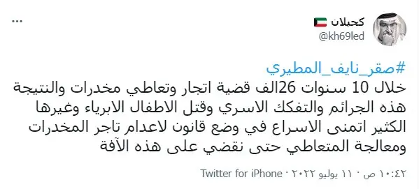 وكتب ناشط يدعى "كحيلان" في تغريدة له: "خلال 10 سنوات 26 ألف قضية اتجار وتعاطي مخدرات والنتيجة هذه الجرائم والتفكك الأسري وقتل الأطفال الأبرياء وغيرها الكثير".