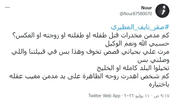 وكتبت في تغريدة لها: "كم مدمن مخدرات قتل طفله أو طفلته أو زوجته أو العكس؟.. مرت علي بحياتي قصص تخوف وهذا بس في قبيلتنا واللي وصلني بس.. تخيلوا البلد كامله أو الخليج.. كم شخص أهدرت روحه الطاهرة على يد مدمن مغيب عقله باختياره".