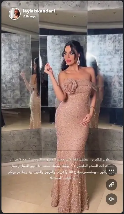 ونشرت ليلى في وقت سابق مقطعا لها تظهر فيه بفستان أنيق علقت عليه بقولها: "سيحاول الكثيرون إحباطك فقط لأنك جميل ناجح ومستقل.. لا تسمح لأحد أن يسلبك ذلك السلام الداخلي.. وثقتك بنفسك.. نعم أنا اليوم أفضل وأجمل وأقوى بكثير.. وسأستمر بإذن الله والأرزاق والتوفيق والقبول بيد ربنا مو بيدكم يا البشر الحمدلله".