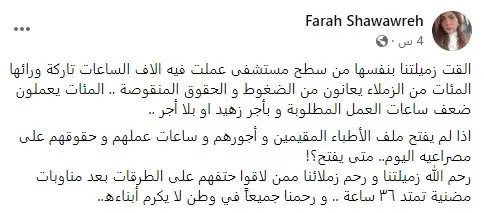 في ذات الإطار، قالت فرح شواوره الطبيبة بوزارة الصحة الأردنية، العاملة بمستشفى الأمير حمزة بالعاصمة عمان، عبر "فيسبوك"، إن زميلتها ألقت بنفسها من سطح المستشفى.