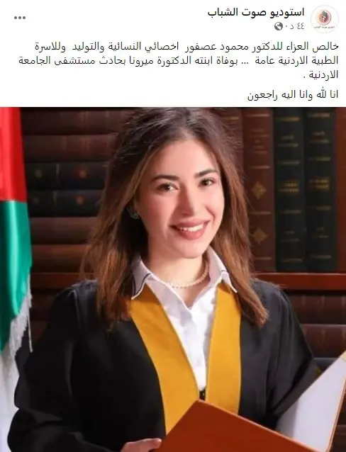 وقال حساب ستوديو "صوت الشباب" في منشور على "فيسبوك": "خالص العزاء للدكتور محمود عصفور أخصائي النسائية والتوليد وللأسرة الطبية الأردنية عامة… بوفاة ابنته الدكتورة ميرونا بحادث مستشفى الجامعة الأردنية ..إنا لله وإنا إليه راجعون".