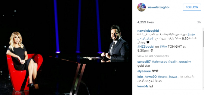ونشرت نوال الزغبي، صورة لها على "انستغرام"، تظهر مع نيشان، معلقة على الصورة، "سهرة مميزة الليلة بمناسبة عيد الحب على شاشة الساعة 9:30 مساء" بتوقيت بيروت مع نيشان.