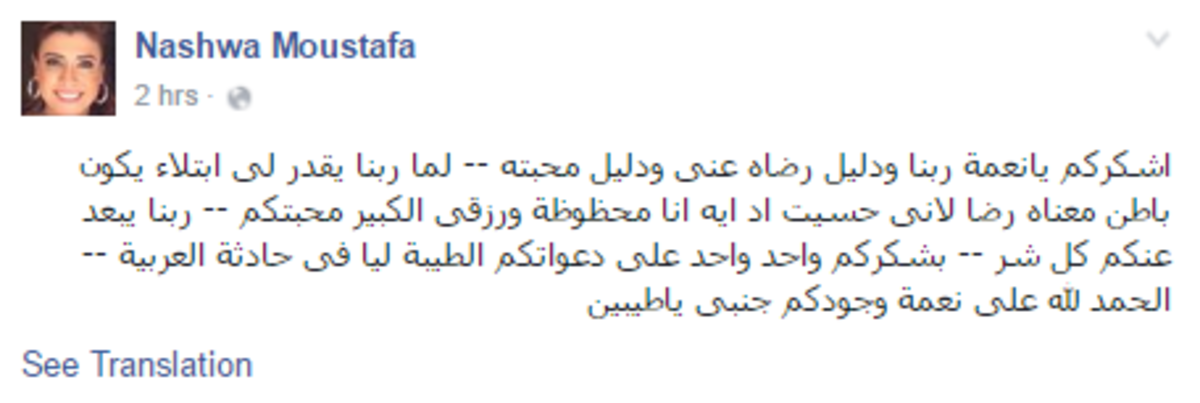 وتابعت: "ربنا يبعد عنكم كل شر، بشكركم واحد واحد على دعواتكم الطيبة ليا في حادثة العربية، الحمد لله على نعمة وجودكم جنبي ياطيبين".