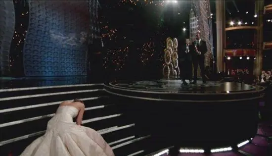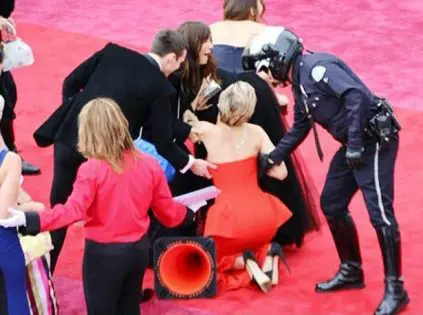 ولفتت صحيفة (ميرور) البريطانية، إلى سوابق"لورانس، في السقوط على السجادة الحمراء، فأثناء تسلمها جائزة الأوسكار في العام 2013 عن دورها في فيلم "Silver Linings Playbook"، لم تستطع الحفاظ على توازنها خلال صعودها إلى المسرح.