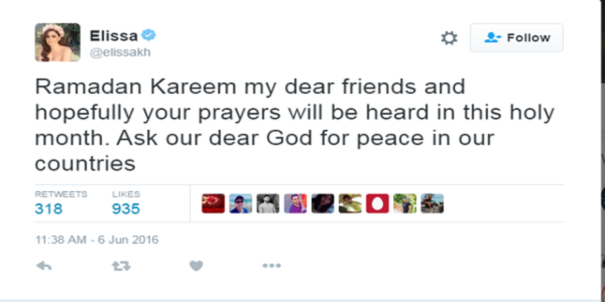 هنأت الفنانة اللبنانية إليسا جمهورها بقدوم شهر رمضان المبارك من خلال تغريدة عبر حسابها على موقع التواصل الاجتماعي "تويتر"، متمنية لهم صلاة وأعمالاً مقبولة، بالإضافة إلى تمنيها حلول السلام بدولنا العربية خلال الشهر الفضيل.
