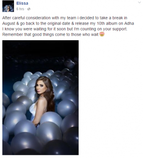 وكتبت إليسا، عبر صفحتها الرسمية على موقع فيس بوك: "بعد دراسة متأنية مع فريقي، قررت أن نأخذ استراحة في أغسطس والعودة إلى التاريخ الأصلي والإفراج عن ألبومي العاشر في عيد الأضحى".