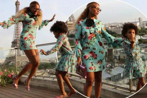 وارتدت بيونسيه فستاناً أخضر من تصميم غوتشي مع صندل وردي لامع، وحقيبة من نفس اللون مزينة باللون الأزرق، وكانت ابنتها تصغير لإطلالتها الرائعة.