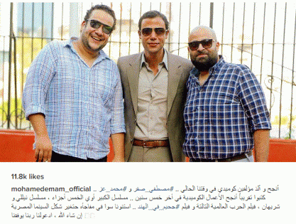 نشر إمام، صورة جديدة عبر حسابه على إنستغرام"، معلقًا: "من أنجح وألذ مؤلفين كوميدييين في وقتنا الحالي، مصطفى صقر ومحمد عز".