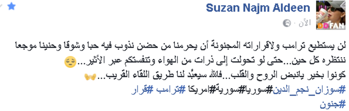 ونشرت نجم الدين، عبر صفحتها الرسمية على موقع التواصل الاجتماعي فيسبوك صورة تجمعها بأولادها وكتبت:" لن يستطيع ترامب بقراراته المجنونة أن يحرمنا من حضن نذوب فيه حباً وشوقاً وحنيناً موجعاً ننتظره كل حين، حتى لو تحولت إلى ذرات من الهواء وتنفستكم عبر الأثير".