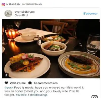 واختار صاحب فيسبوك وزوجته برسيلا تشان الجلوس في مكان منعزل من المطعم للاستمتاع بعشاء رومانسي، ولم يتمكن العاملون من التحدث إليهما أو التقاط أية صورة معهما، لكنهم كانوا مصرين على الاحتفاظ بأية ذكرى من هذا اللقاء، فالتقطوا صورة صغيرة لوجبة الطعام التي تناولاها.