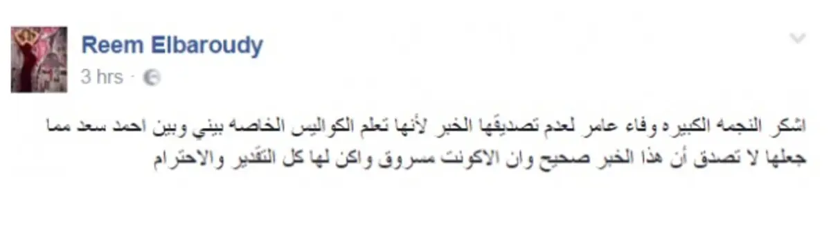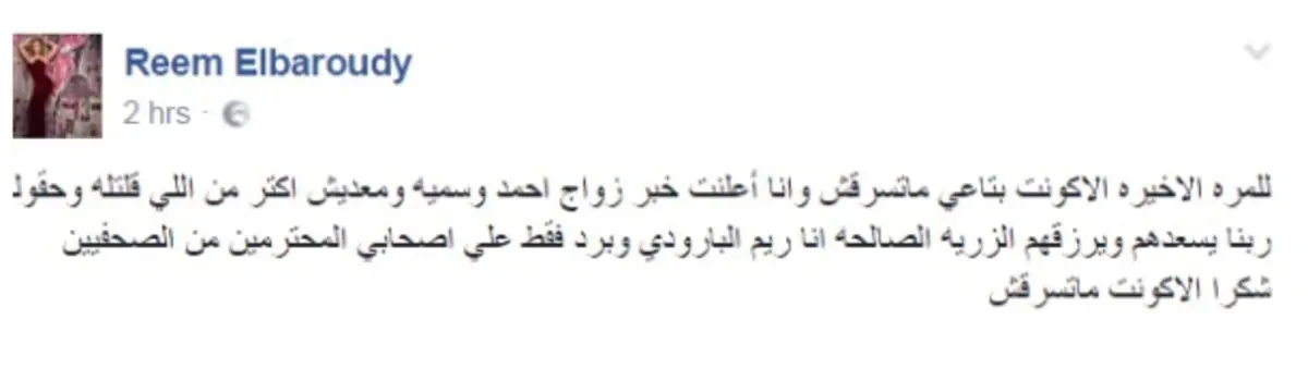 الغريب في الأمر أن الحساب المتعارف عليه بأنه للفنانة ريم البارودي أكد ونفى الشائعة في ذات الوقت، حيث قالت ريم في منشورها الأول إنها تبارك الزواج قبل أن تعود وتقول إن حسابها مخترق، لتعود مجددًا وتؤكد أن حسابها لم يخترق والمعلومة مؤكدة.