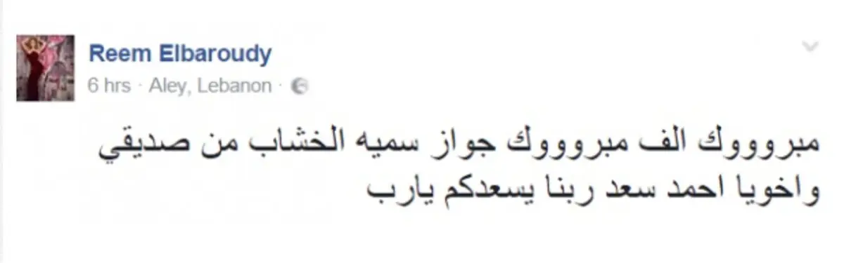 وكانت البارودي قد وجهت تهنئة لسعد وسمية عبر حسابها الشخصي على فيس بوك بمناسبة زواجهما- حسب قولها.