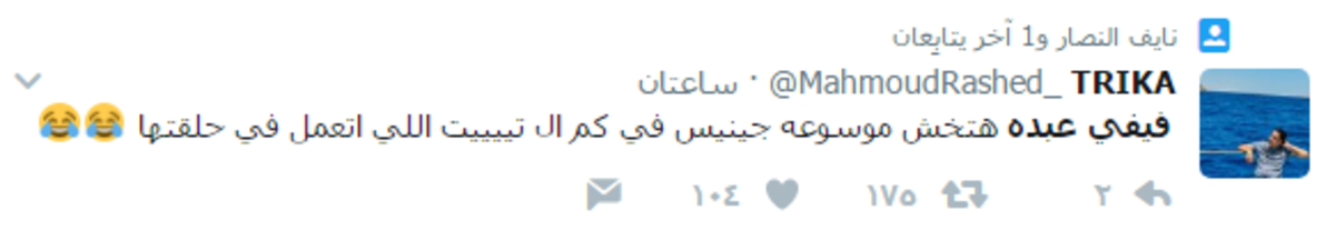 فيما قال آخر: “فيفي عبده ستدخل موسوعة غينيس بعدد الكلمات الساقطة التي قالتها في الحلقة".