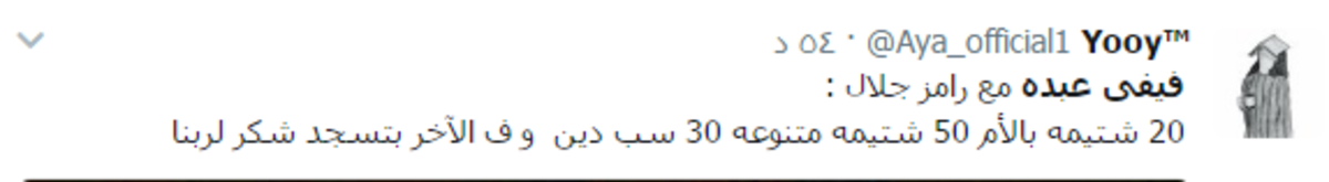 وفي تغريدة ساخرة، حاول أحدهم أن يقدم احصائية بعدد الشتائم التي تلفظت بها الفنانة المصرية خلال الحلقة، مؤكدا أن كل هذا الكلام اختتمته في فيفي عبده بـ"سجدة شكر".