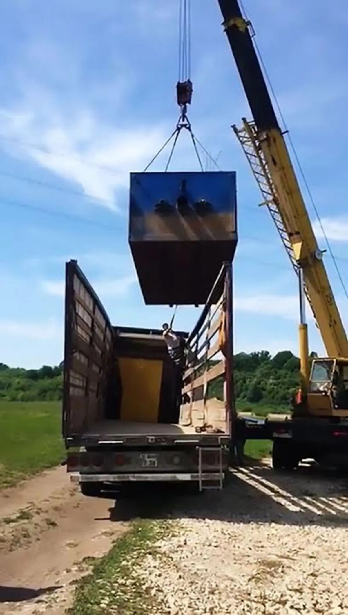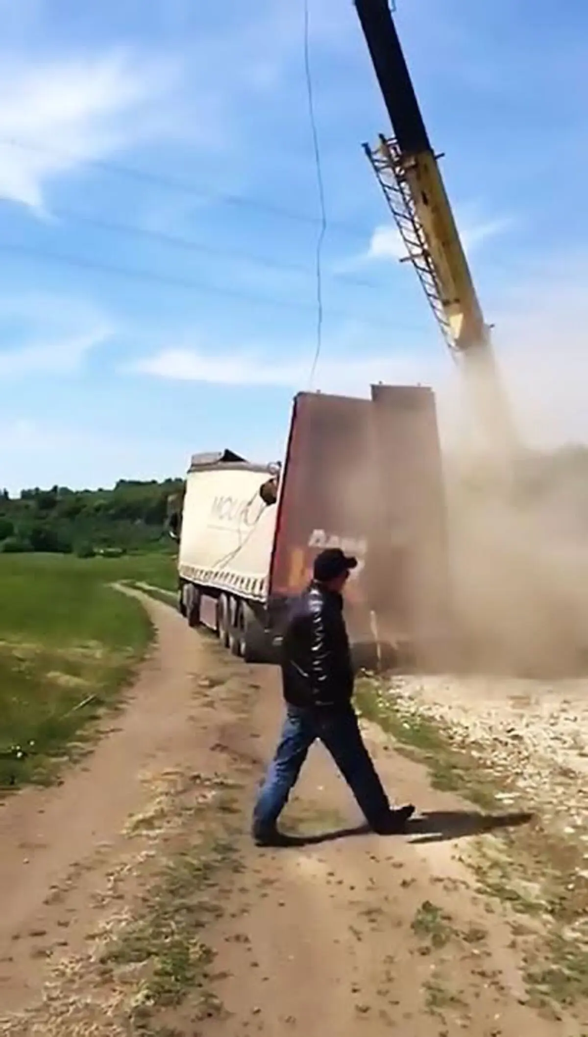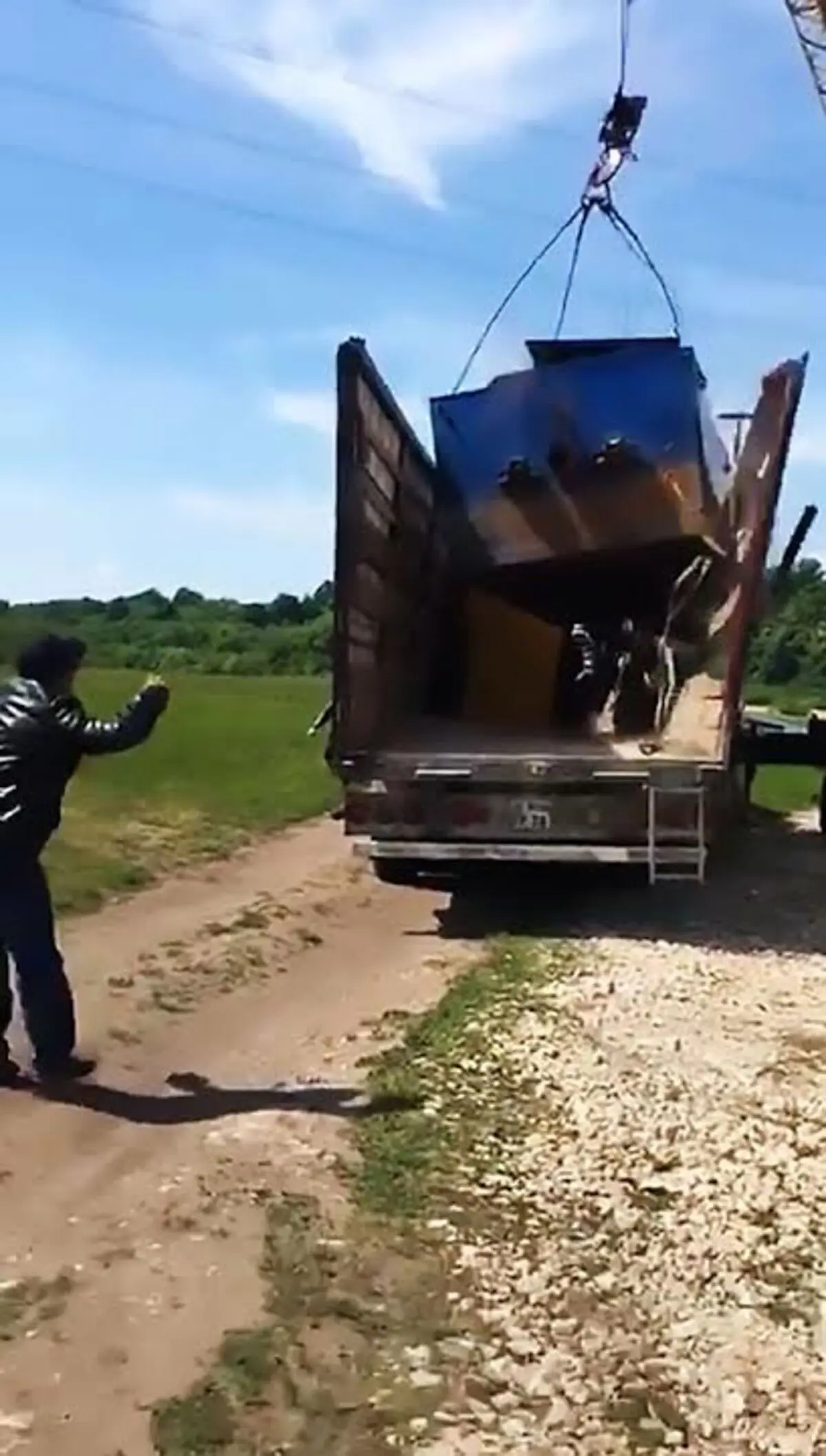سقطت حاوية معدنية بشكل مفاجئ على شاحنة لنقل البضائع أثناء تواجد سائقها داخلها، في شمال غرب كازاخستان.