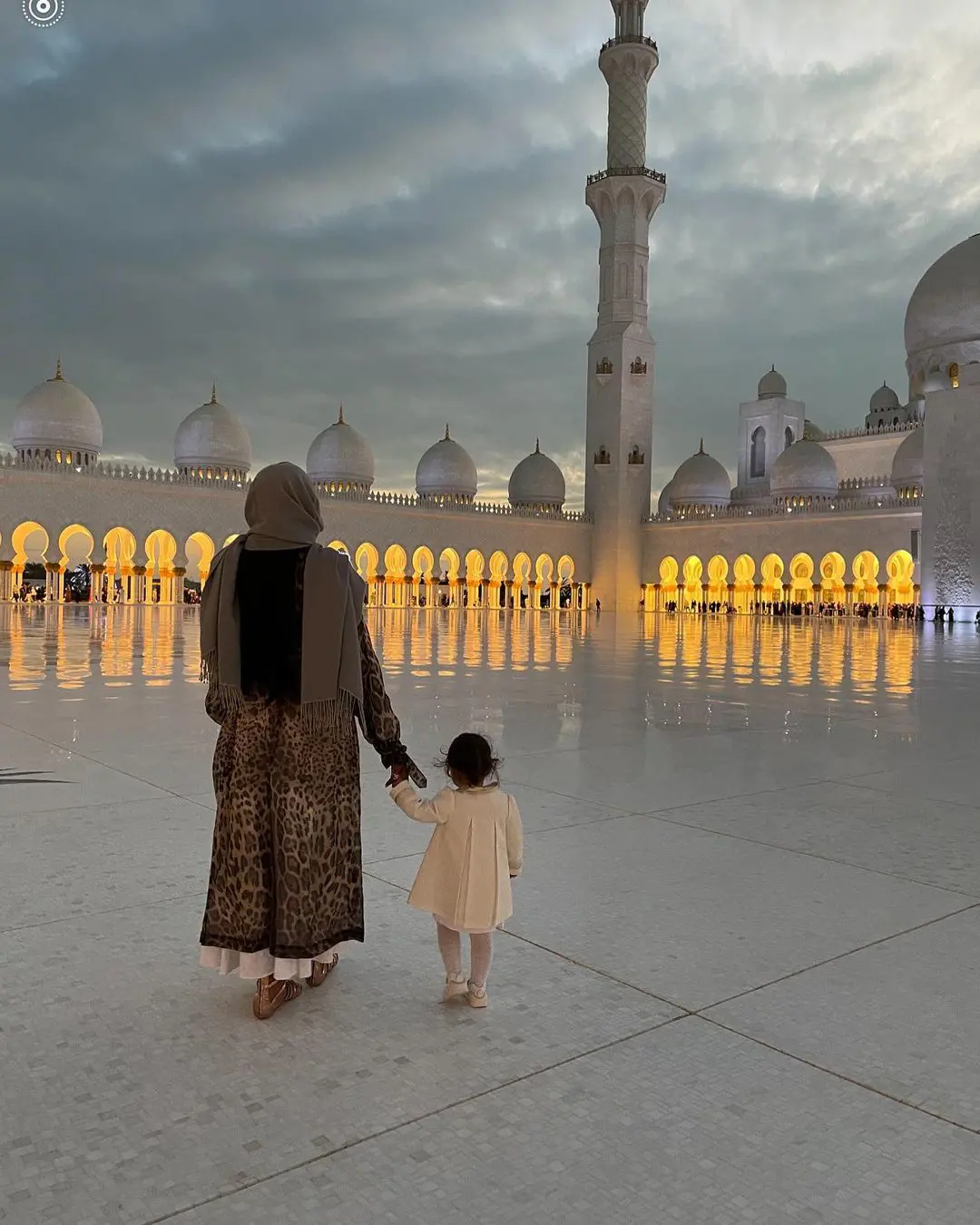 وظهرت ناعومي، 52 عامًا، في الصور وهي تقف أمام جامع الشيخ زايد الكبير واضعة الحجاب، وفي لقطة أخرى أمسكت بيد طفلتها.