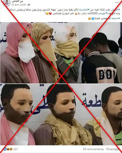 وراجت الصورة المركبة بشكل واسع خلال الساعات الأخيرة، بعنوان مرفق: "القبض على ثلاثة أفراد أفارقة يمارسون مهنة التسول ويتزينون بمكياج ولبس نسائي ومدخولهم اليومي 5 آلاف دينار في شوارع طرابلس".