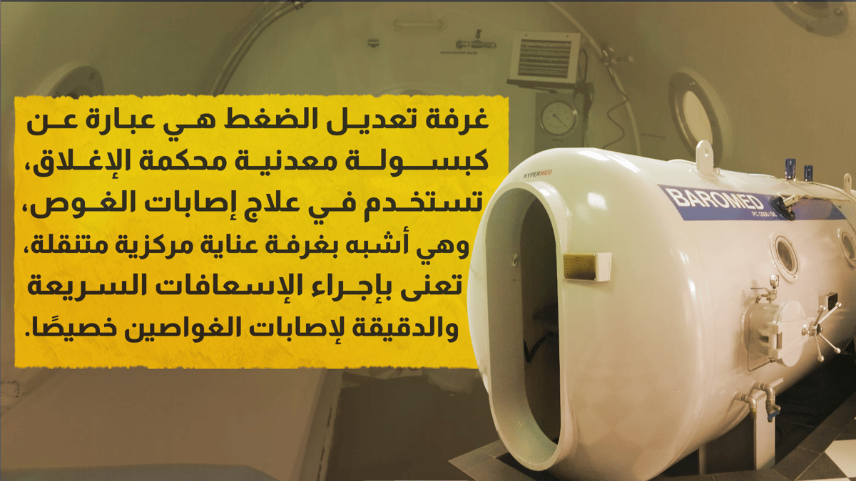 كما أشار الجبالي إلى أن العلاج المباشر فور الخروج من المياه، من خلال غرفة تقليل الضغط، الواجب توافرها في مكان المهمة، يعد أمرًا ضروريًا، لأنه يمنع حدوث أي مضاعفات، وينقذ حياة الغواص.