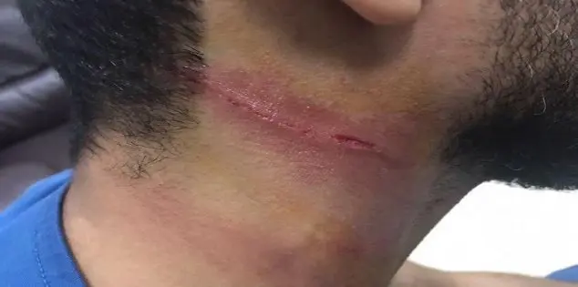 وأضاف المتعدى عليه، أنه أصيب بجروح ونزيف في الرقبة وكدمات متفرقة.