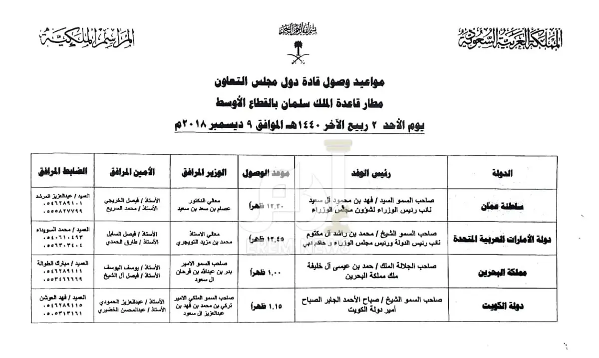 وتظهر القوائم التي حصل عليها صحفيو إرم نيوز المتواجدون في المركز الإعلامي المخصص لتغطية فعاليات القمة الخليجية، مواعيد وصول قادة وفود سلطنة عمان والإمارات والكويت والبحرين، مع تنويه إلى أن العاهل السعودي الملك سلمان بن عبدالعزيز آل سعود سيكون على رأس مستقبليهم في قاعدة الملك سلمان الجوية.